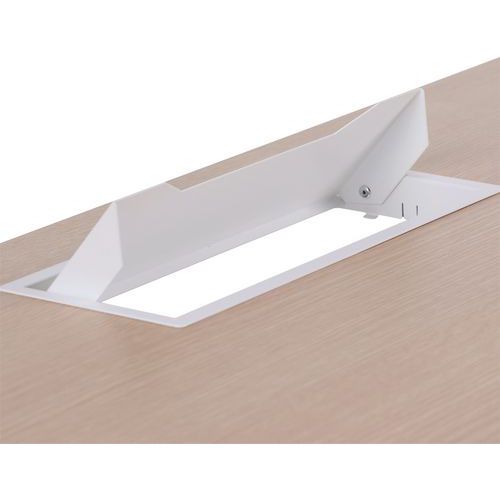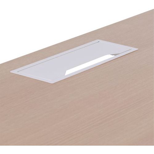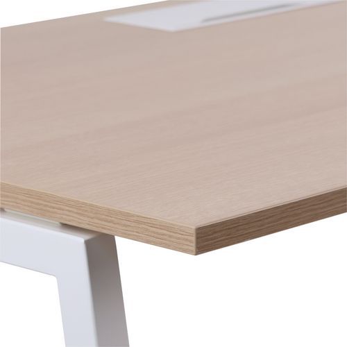 Scrivania dritta con piedi ad arco (A). Piano in melaminico di 25 mm di spessore con profili in ABS di 2 mm. 10 mm tra i piedi e la scrivania. 2 travi di supporto in metallo (40x20 mm) Tubo dei piedi in metallo (40x40 mm) con piedini in plastica per il livellamento (+10 mm). Piano con apertura per il passaggio dei cavi, con tappo.