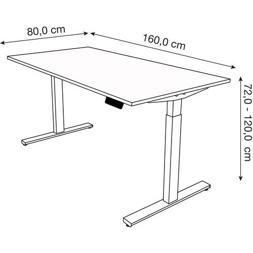 Scrivania regolabile in altezza da 72 cm a 120 cm. Ripiano superiore in melaminico ABS di 19 mm. Struttura in acciaio e piedi a forma di T. Funzione di memoria: 4 altezze preregistrate per una regolazione con la massima facilità. Si monta a una velocità di 36 mm/s.