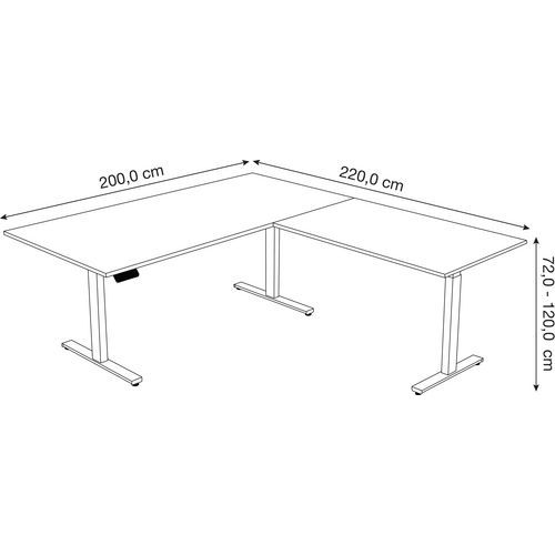Scrivania elettrica con estensione dritta. Piano in melaminico con spessore di 19 mm. Base a T. Regolabile in altezza da 72 cm a 120 cm.