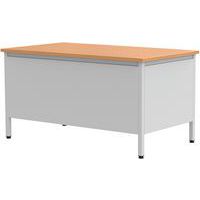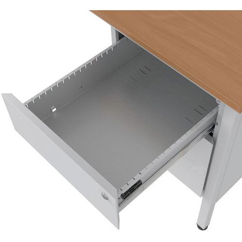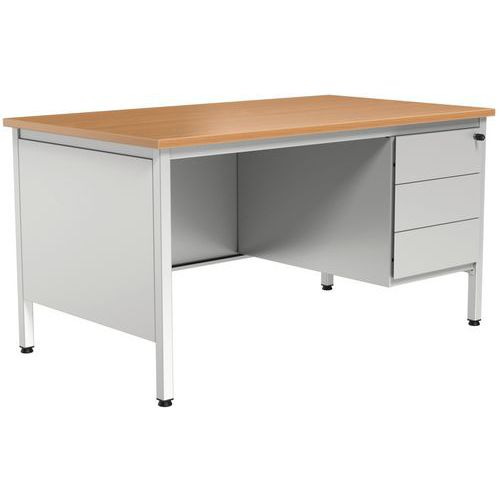 Scrivania semi direzionale Confort 2 con cassettiera a 3 cassetti. Gambe tubolari quadrate 35x35x2 mm con rinforzo angolare in metallo. Base su martinetti regolabili in materiale sintetico. Solida struttura metallica in lamiera da 1,5 mm. Le parti metalliche sono verniciate in polvere epossidica di poliestere. Altezza del tavolo fisso: standard a 75 cm (incl. top da 25 mm). Realizzato nell'UE