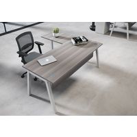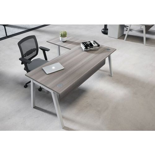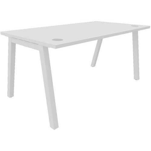 Scrivania singola con superficie in melaminico. Elettrificazione: ripiano dotato di passacavi. Pannello in melaminico ripiano Structurex® con profili in ABS antiurto 2 mm. Base con struttura con arco ad “A” obliquo. Ideale per il telelavoro