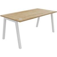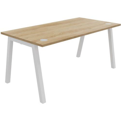 Scrivania singola con superficie in melaminico. Elettrificazione: ripiano dotato di passacavi. Pannello in melaminico ripiano Structurex® con profili in ABS antiurto 2 mm. Base con struttura con arco ad “A” obliquo. Ideale per il telelavoro