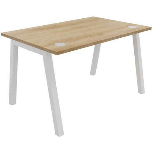 Scrivania singola con superficie in melaminico. Elettrificazione: ripiano dotato di passacavi. Pannello in melaminico ripiano Structurex® con profili in ABS antiurto 2 mm. Base con struttura con arco ad “A” obliquo. Ideale per il telelavoro