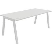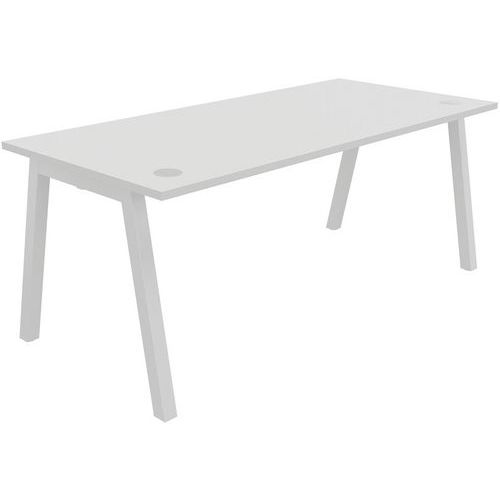 Scrivania singola con superficie in melaminico. Elettrificazione: ripiano dotato di passacavi. Pannello in melaminico ripiano Structurex® con profili in ABS antiurto 2 mm. Base con struttura con arco ad “A” obliquo. Ideale per il telelavoro