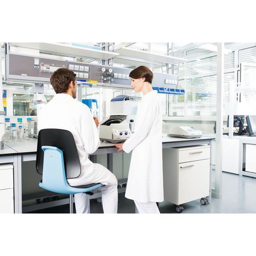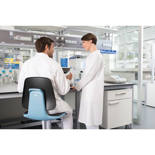 Sedia da officina compatibile con sale bianche. Funzioni ergonomiche innovative: segue i movimenti del corpo. 3D-Flex sul bordo della sedia e sullo schienale Facile da maneggiare grazie alle maniglie integrate. Perfetta per il vostro laboratorio. Lavabile e resistente ai disinfettanti.