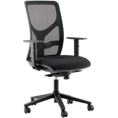Sedia da ufficio con braccioli e schienale in maglia, molto comoda. Schienale con supporto lombare regolabile in altezza. Movimenti sincronizzati della seduta e dello schienale con 4 posizioni di blocco. Ideale per il telelavoro