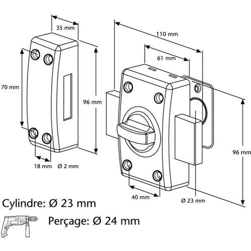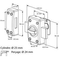 Scatola e riscontro in acciaio stampato. Chiavistello acciaio cromato avvitato (e intercambiabile). Distanza centro vite (40 x 70 mm)A con manopola rotonda (CB). Cilindro Ø 23 mm in ottone a 5 pistoncini. Foratura: Ø 24 mm Bordo di finitura. Fornito con viti. Fornito con 3 chiavi.