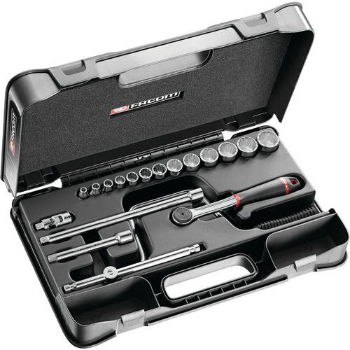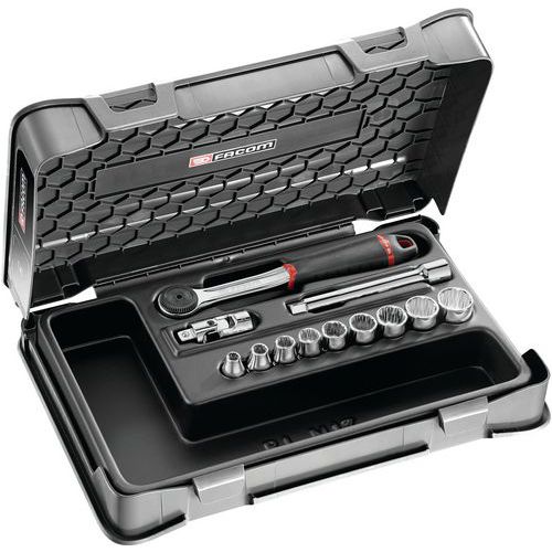 Contiene: 1 cricchetto impermeabile da 3/8 ad alte prestazioni: J.161B. 9 chiavi a bussola a 12 punti da 3/8 in pollici: J.1/4' - 5/16' - 3/8' - 7/16' - 1/2' - 9/16' - 5/8' - 11/16' - 3/4'. 1 prolunga 3/8: L 125 mm (J.210) . 1 giunto cardanico da 3/8: J.240A. Consegnato con una tavola di pittogrammi per personalizzare la tua scatola. Valigetta vuota: BP.MBOXM. Vassoio termoformato M (309 x 188 mm): PL.M17.