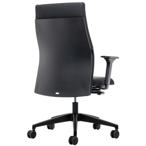 Sedia da ufficio girevole con schienale alto imbottito. Sistema su meccanismo sincrono con regolazione automatica della tensione. Supporto lombare regolabile in altezza. Braccioli a T 4D per alleviare la muscolatura del collo e del collo. Bloccabile in posizione anteriore e posteriore per una maggiore flessibilità.