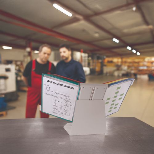 Questo supporto a parete consente di recuperare facilmente documenti importanti. Il supporto da scrivania protegge i documenti dalla polvere. Particolarmente adatto ad ambienti industriali.