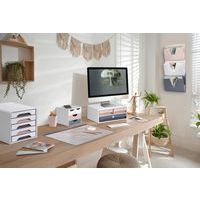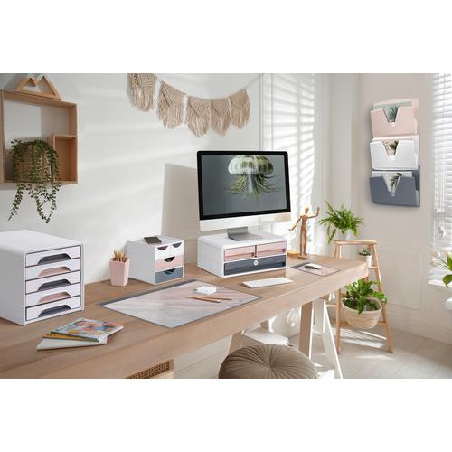 Il foglio superiore antiriflesso si solleva per consentire l'inserimento di foto e personalizzare lo spazio di lavoro.