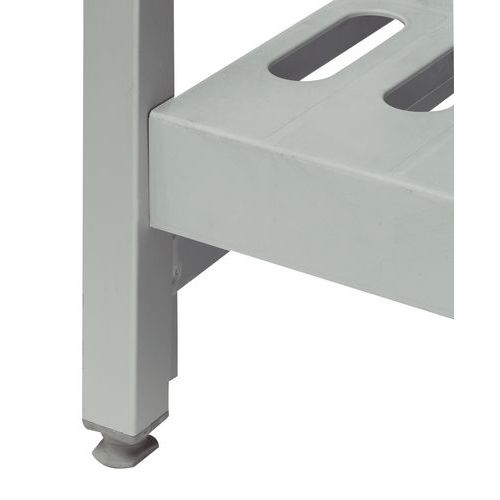 Spalla con piedi regolabili per livellamento perfetto al suolo. Terminazione alta della spalla con tappo in PVC. Struttura tubolare a sezione quadrata in alluminio anodizzato. Livellamento al suolo: ± 20 mm. Sezione: 25 x 25 mm.