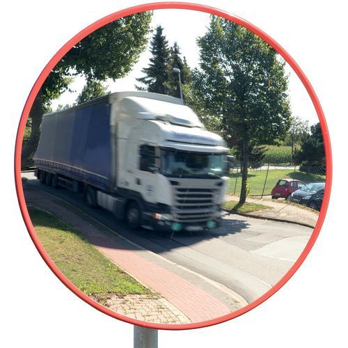 Specchio di sicurezza industriale per migliorare la sicurezza nelle aree industriali, ecc. Resistente e robusto: testato a forti venti forza 12 (uragano superiore a 117 km / h). Fissaggio a quattro punti su paletto o parete con giunto sferico per una migliore regolazione. Cornice rossa per attirare l'attenzione. Specchio acrilico: più resistente del vetro. Ottimo riflesso dell'immagine senza deformazioni. Facile da installare.