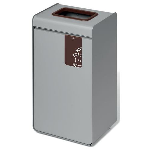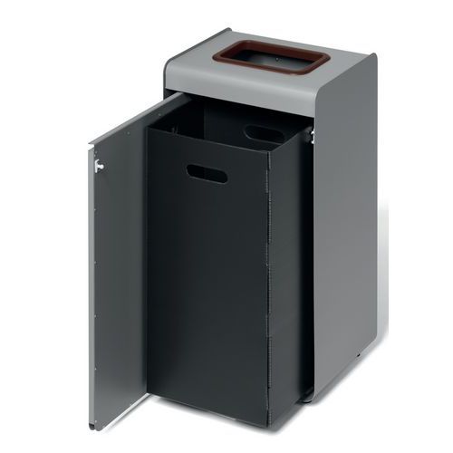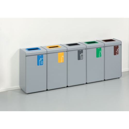 Contenitore per riciclaggio in metallo termolaccata con contenitore interno in plastica. Anello di inserimento colorato e pittogramma sul pannello anteriore per identificare i diversi tipi di rifiuti. Può essere utilizzato in spazi interni come edifici pubblici, scuole, mense. Facile apertura dello sportello grazie al meccanismo push-to-open. Facile svuotamento del contenitore interno. I piedini regolabili garantiscono stabilità su superfici irregolari.