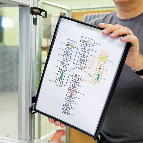 - Facile da maneggiare grazie al sistema di fissaggio brevettato magnetico delle cartelline.