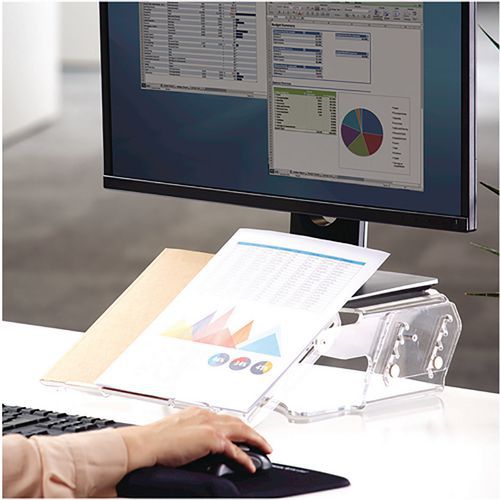 | Descrizione | Supporto per monitor regolabile e portadocumenti Clarity™, Carico max.: 15 kg, Colore: Trasparente |