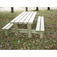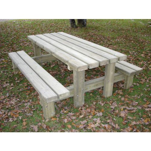 Trattamento in autoclave a pressione, classe IV Soluzione acquosa senza cromo né arsenico Tavolo con panche anche noto come tavolo da pic-nic Doghe sezione 14,5 x 6,8 cm Gambe e rinforzi sezione 14,5 x 6,8 cm