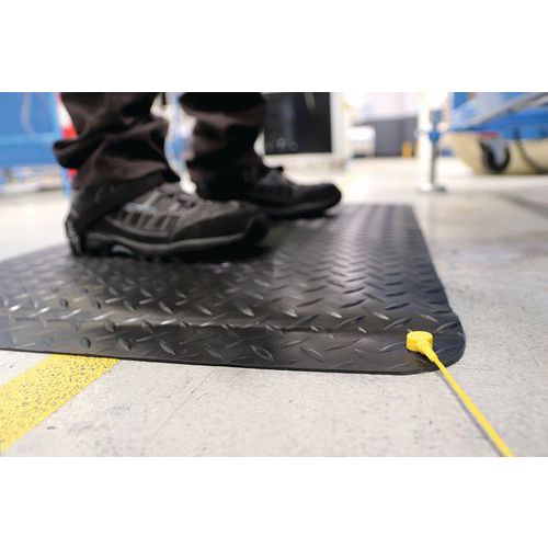 Tappeto antifatica antistatico resistente per aree sensibili all'elettricità statica. Superficie in vinile e base in PVC espanso, assemblato per fusione, non incollato. Lo strato conduttore centrale protegge gli operatori e i componenti. Resistente a numerosi prodotti chimici industriali. Con bordi smussati di serie per ridurre il rischio di caduta.