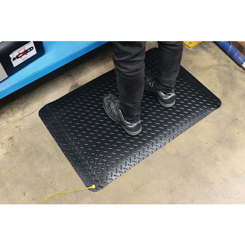 Tappeto antifatica antistatico resistente per aree sensibili all'elettricità statica. Superficie in vinile e base in PVC espanso, assemblato per fusione, non incollato. Lo strato conduttore centrale protegge gli operatori e i componenti. Resistente a numerosi prodotti chimici industriali. Con bordi smussati di serie per ridurre il rischio di caduta.