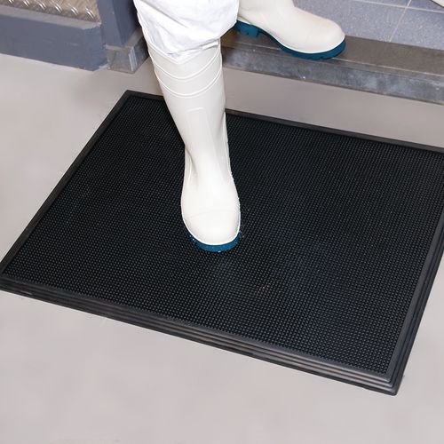 Tappetino adatto per qualsiasi ambiente che richieda la pulizia e la disinfezione delle scarpe. Ideale per l'ingresso in ambienti in cui si manipolano o trasformano cibi. Migliaia di rilievi puntinati flessibili consentono di eliminare tramite sfregamento lo sporco presente. In caso di passaggio sul tappeto, le estremità dei rilievi puntinati si piegano facendo immergere le suole in una soluzione disinfettante. Consente di evitare eventuali contaminazioni in ambienti agroalimentari.