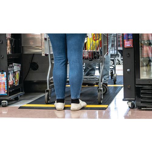 Griglia in PVC morbido nera con striscia gialla alternata di posizionamento per rispettare il distanziamento sociale. Eccellente assorbimento acustico, molto confortevole per attività in piedi grazie alla copertura delle irregolarità del suolo. Realizzata in PVC non poroso per una resistenza naturale alla proliferazione di batteri. Struttura a 2 strati incrociati, con griglia in PVC aperta per un eccellente drenaggio dei liquidi. Pulizia semplice: da sollevare o arrotolare per l'impiego con un tubo ad alta pressione. Per far rispettare agevolmente le distanze di sicurezza a visitatori, clienti, dipendenti