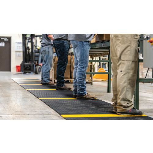 Griglia in PVC morbido nera con striscia gialla alternata di posizionamento per rispettare il distanziamento sociale. Eccellente assorbimento acustico, molto confortevole per attività in piedi grazie alla copertura delle irregolarità del suolo. Realizzata in PVC non poroso per una resistenza naturale alla proliferazione di batteri. Struttura a 2 strati incrociati, con griglia in PVC aperta per un eccellente drenaggio dei liquidi. Pulizia semplice: da sollevare o arrotolare per l'impiego con un tubo ad alta pressione. Per far rispettare agevolmente le distanze di sicurezza a visitatori, clienti, dipendenti