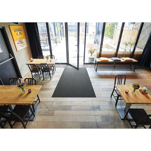Tappeto ultra abrasivo in velluto di poliammide materiale Econyl®. Fibra di altezza 6 mm, retro spesso 2 mm in PVC senza ftalato. Facile da pulire: aspirapolvere, getto ad alta pressione, lavatappezzeria. Per traffico pedonale intenso e passaggio di persone a mobilità ridotta. Fabbricato in Europa.