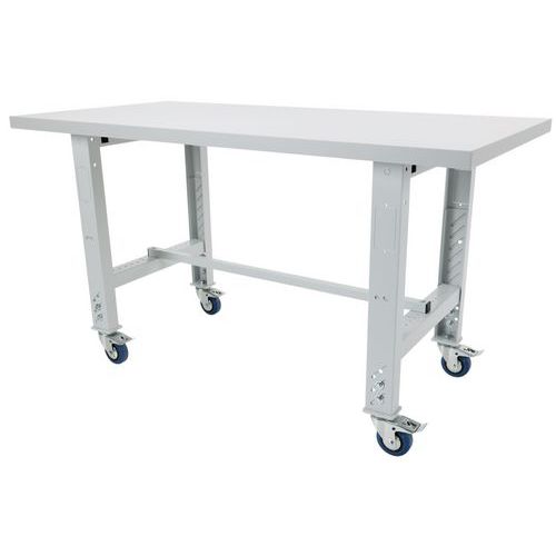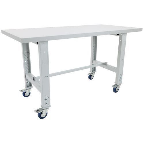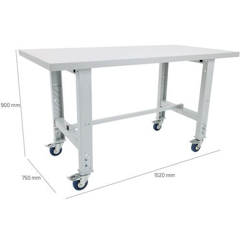 Postazione di montaggio regolabile in altezza fino a 1050 mm. Piano in faggio multistrato grigio ad alta resistenza. 4 ruote girevoli con freno per spostare la vostra postazione in base alle vostre esigenze. Larghezze disponibili: 1520 o 2000 mm. Possibilità d'installare una sovrastruttura con accessori.