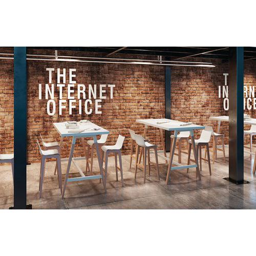 I tavoli alti Cohésion rispondono alle nuove modalità di lavoro in piedi che favoriscono lo scambio e la collaborazione. Le finiture naturali dei ripiani unite alla base trapezoidale in metallo o legno conferiscono uno stile industriale. Piani in pannelli alveolari sp. 38 mm, con trattamento anti-riflessi e anti-graffio, dalle proprietà anti-batteriche. Gambe ad arco A in metallo assemblate con traversa strutturale. Profili in ABS antiurto da 2 mm.