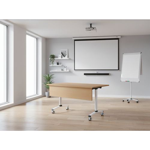 Il tavolo da riunione rettangolare pieghevole con pannello di fondo Axe con piano girevole consente di risparmiare spazio quando riposto. Blocco automatico del piano in posizione di lavoro (orizzontale) e verticale (stoccaggio). Sistema di collegamento rapido tra i piani mediante viti a testa zigrinata. Dotato di 4 rotelle Ø 75 mm con freno. Il tavolo da riunione rettangolare pieghevole con pannello di fondo Axe con piano girevole consente di risparmiare spazio quando riposto. Blocco automatico del piano in posizione di lavoro (orizzontale) e verticale (stoccaggio). Sistema di collegamento rapido tra i piani mediante viti a testa zigrinata. Dotato di 4 rotelle Ø 75 mm con freno. Altezza pannello di fondo 25 cm. Bordi in ABS spessi 2 mm. Gambe in metallo laccato epossidico. Prodotto in Francia. Fornito con gambe smontate.