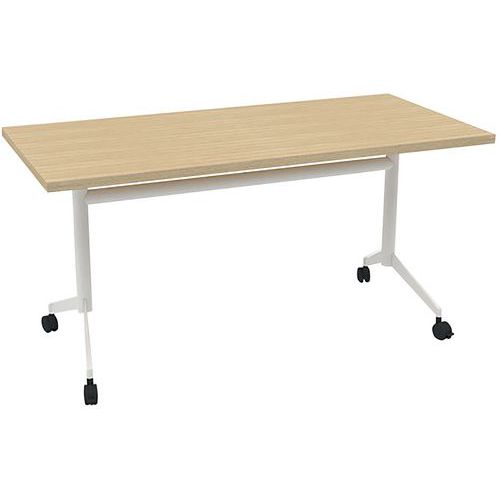 Tavolo da riunione rettangolare con sistema di piegatura semplice. Rotazione in verticale per ottimizzare gli spazi di stoccaggio del tavolo. Rotella direzionale, con freno integrato su ciascuna ruota.
