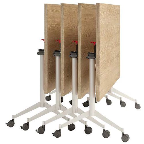 Tavolo da riunione rettangolare con sistema di piegatura semplice. Rotazione in verticale per ottimizzare gli spazi di stoccaggio del tavolo. Rotella direzionale, con freno integrato su ciascuna ruota. Ideale per il vostro spazio di coworking, per lavoro in gruppo.