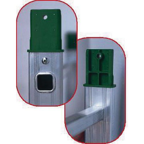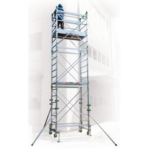 Trabattello professionale in alluminio, facile e rapido da montare. Livellatori a vite telescopici fino a 45 cm da ordinare separatamente. Stabilizzatori in alluminio (obbligatori e inclusi a partire da 5.90 m) regolabili con blocchi a morsa in alluminio: allargano la base fino a 110 cm (A071493). Stabilizzatori per prodotto sotto i 5,90 m di altezza da ordinare separatamente. Piano di lavoro doppio, rivestito in melaminico antiscivolo, con botola fermapiedi in alluminio. Dotato di kit di protezione anticaduta altezza 120 cm. Prodotto a norma italiana DL 81/2008 Realizzato in Italia Garanzia Cliente : 3 anni Carico max. (kg) : 235