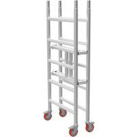 Ponteggio in alluminio a tubo tondo dal diametro di 50 mm. Base pieghevole e aggancio rapido per un montaggio veloce. Ruote con freno diametro 125 mm. Piano di lavoro resinato dal telaio in alluminio con botola