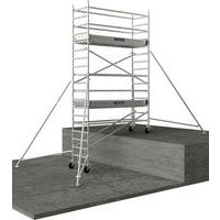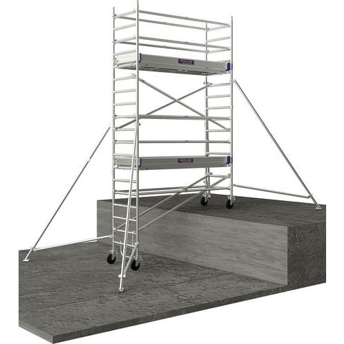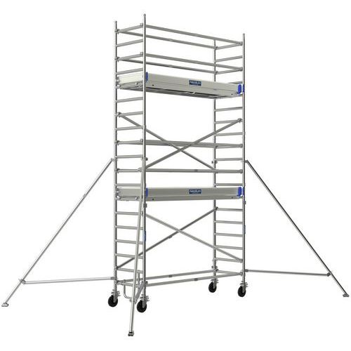 Trabattello mobile, struttura in alluminio saldato, versione con correnti/sottocorrenti. Zoccoli applicati rimovibili in alluminio (150 mm), montaggio rapido. Piastrina dello stabilizzatore antiscivolo orientabile, con regolazione del livello integrata. Ruote con blocco estremamente potente e regolazione millimetrica di 200 mm ogni 12,5 mm. Sistema di collegamento brevettato Ergoblock® per un bloccaggio super affidabile in 1 solo gesto. Pianale di tipo R08 Comabi. Realizzato in Francia Carico max. (kg) : 200