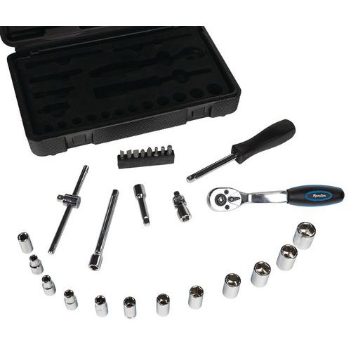 Valigetta in plastica composta da 26 utensili da 1/4": Bussole da 1/4" Ø da 5 a 14 mm 1 cardano universale da 1/4" 2 prolunghe da 1/4" 1 cricchetto Punte 1 prolunga con manico 1 bussola porta-punte