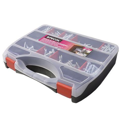 Composizione della valigetta: Ø 6 x 30 mm (75 pezzi), Ø 6 x 40 mm (50 pezzi), Ø 6 x 50 mm (40 pezzi), Ø 6 x 60 mm (30 pezzi), Ø 8 x 30 mm (40 pezzi), Ø 8 x 40 mm (30 pezzi), Ø 8 x 50 mm (25 pezzi), Ø 8 x 60 mm (20 pezzi), Ø 8 x 70 mm (15 pezzi), Ø 8 x 80 mm (12 pezzi), Ø 10 x 50 mm (10 pezzi), Ø 10 x 60 mm (10 pezzi).