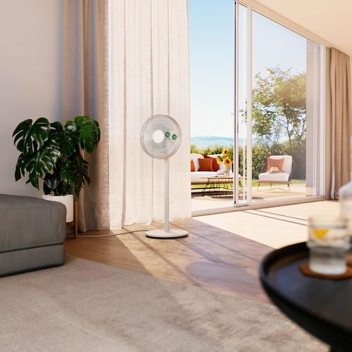 Il ventilatore da pavimento Finn assicura una piacevole freschezza nelle giornate calde grazie alla sua funzione oscillante e alla tecnologia a basso consumo energetico. Grazie alla sua asta rimovibile, Finn mobile può essere utilizzato singolarmente come ventilatore da pavimento, da tavolo o su piede. È estremamente silenzioso e adatto per la camera da letto, dei bambini e l'ufficio. Il ventilatore flessibile ruota silenziosamente avanti e indietro, offrendo un flusso d'aria ottimale nella stanza, fino a 8 metri di distanza. Le funzioni del ventilatore Finn, come la modalità Natural Breeze, la modalità notturna e il timer da 1 a 8 ore, sono molto semplici da controllare utilizzando il telecomando a infrarossi in dotazione.