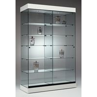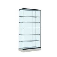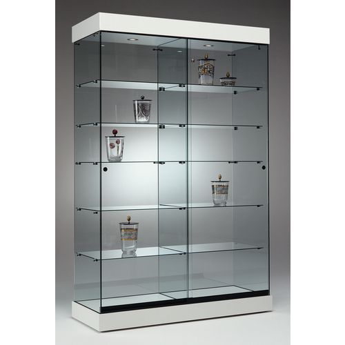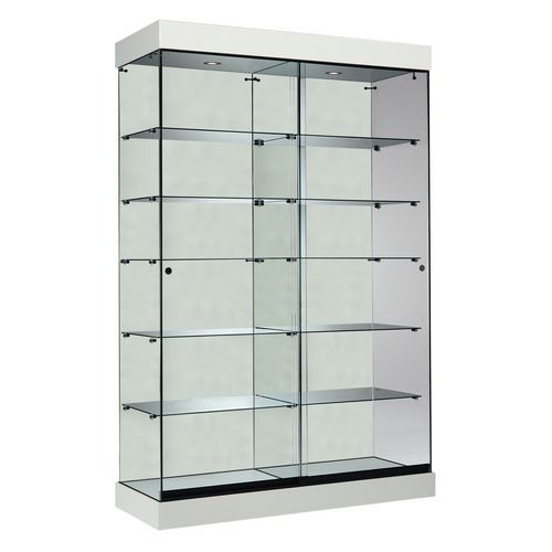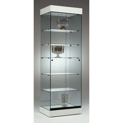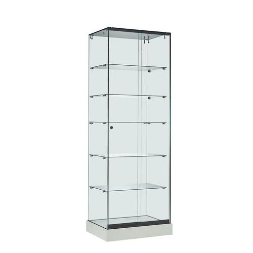 Vetrina interamente in vetro con base nera, bianca o faggio.