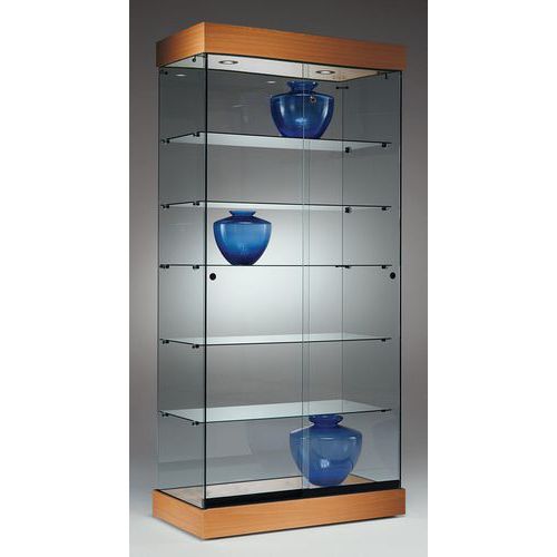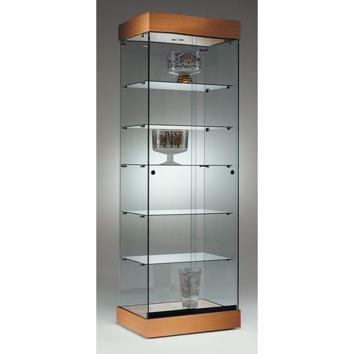 Vetrina interamente in vetro con base nera, bianca o faggio.