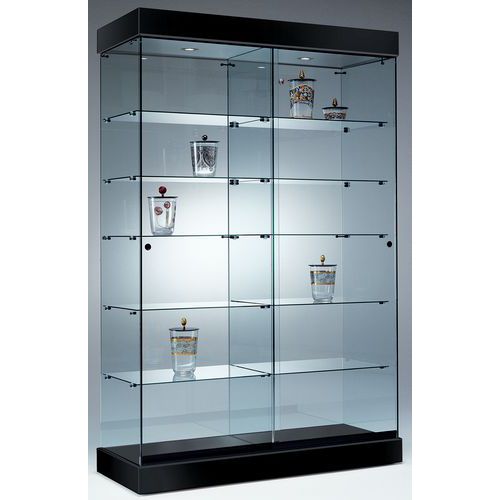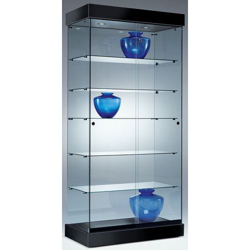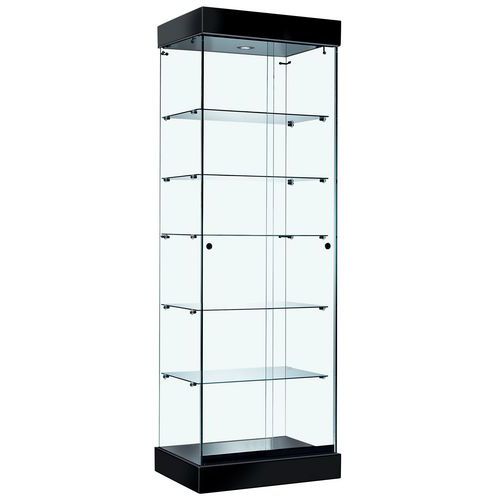 Vetrina interamente in vetro con base nera, bianca o faggio.
