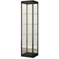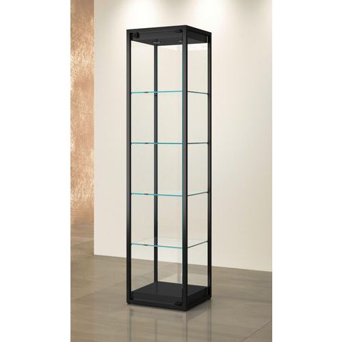 Vetrina espositiva a colonna con illuminazione in alto. Struttura robusta e resistente. Vetro temprato di alta qualità su tutti i lati (anta e ripiani inclusi). Anta a battente con serratura di sicurezza. Vetrina fornita smontata.