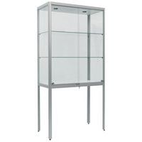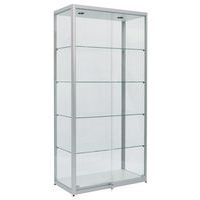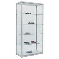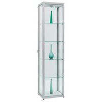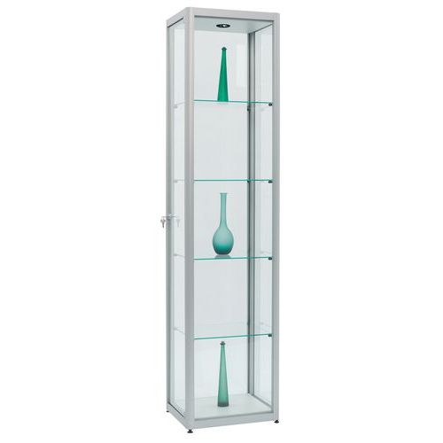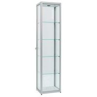 Vetrina espositiva Factory, design con finitura elegante in alluminio anodizzato. Mobile extra largo e molto profondo. Costruzione robusta: cornice speciale, profilato in alluminio. Vetratura esterna di qualità con vetro temprato di sicurezza. Ripiani regolabili in altezza, vetro temprato di sicurezza. Piedi a martinetto regolabili in altezza per i modelli al suolo. Illuminazione LV e ballast elettronico pronti per il collegamento alla presa. Parte superiore e inferiore: pannello in truciolato (anche per il modello ad ante) Realizzato nell'UE Carico max. per ripiano (kg) : 10 Montaggio : Da montare