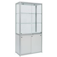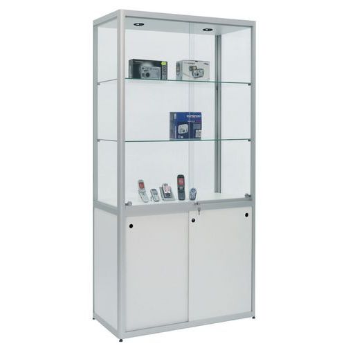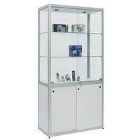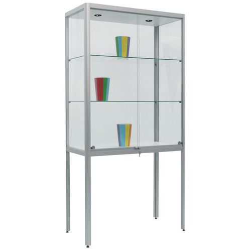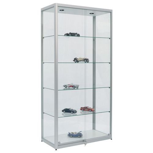 Vetrina espositiva Factory, design con finitura elegante in alluminio anodizzato. Mobile extra largo e molto profondo. Costruzione robusta: cornice speciale, profilato in alluminio. Vetratura esterna di qualità con vetro temprato di sicurezza. Ripiani regolabili in altezza, vetro temprato di sicurezza. Piedi a martinetto regolabili in altezza per i modelli al suolo. Illuminazione LV e ballast elettronico pronti per il collegamento alla presa. Parte superiore e inferiore: pannello in truciolato (anche per il modello ad ante)