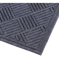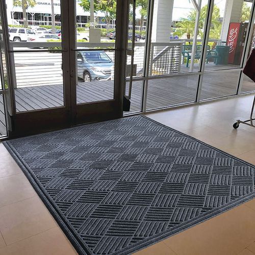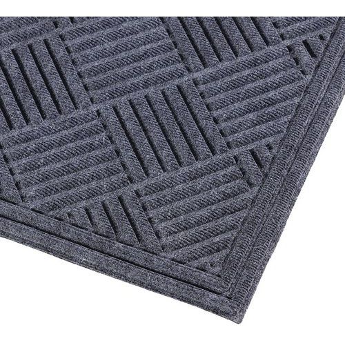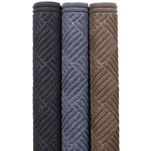 Robusto zerbino dal design brevettato Aqua Dam con 4 bordi in tappeto rinforzato rivestito con tessuto che funge da vasca di raccolta per contenere fino a 4 L d'acqua al metro quadro. Superficie in tessuto stampato per iniezione su un design a punta di diamante striato brevettato non direzionale a doppio effetto per raschiare e rimuovere lo sporco. La suola in gomma robusta fornisce la massima resistenza. I rilievi puntinati sotto la suola riducono al minimo i movimenti del tappeto su tutti i tipi di superficie e lo sollevano leggermente per permettere ai pavimenti umidi di asciugarsi anche sotto al tappeto.